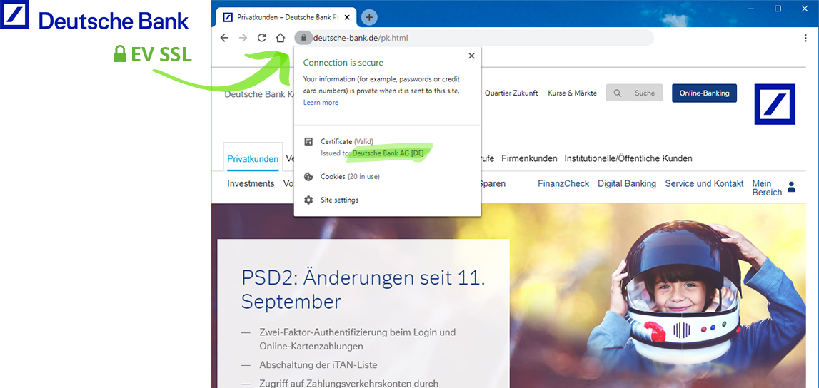 Εδώ μπορείτε να δείτε το πιστοποιητικό SSL EV στο πρόγραμμα περιήγησης. Οι πελάτες βλέπουν το όνομα της τράπεζας στο πρόγραμμα περιήγησης και ξέρουν ότι βρίσκονται στην τοποθεσία web σας.