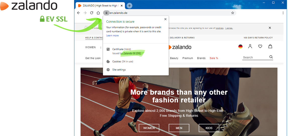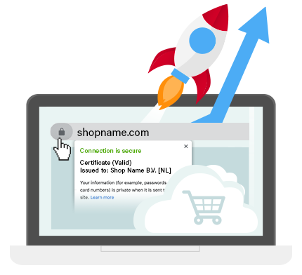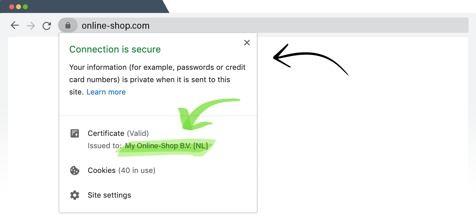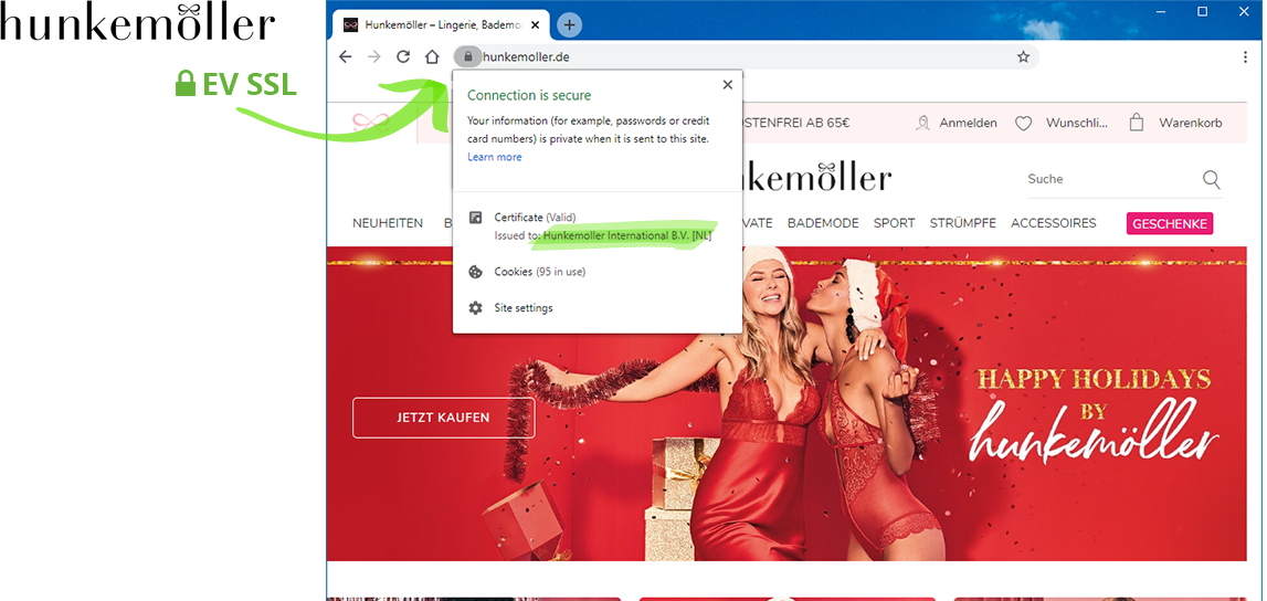 Εδώ μπορείτε να δείτε το πιστοποιητικό SSL EV στο πρόγραμμα περιήγησης. Οι πελάτες βλέπουν το όνομα του ηλεκτρονικού καταστήματός σας στο πρόγραμμα περιήγησης και ξέρουν ότι βρίσκονται πραγματικά στην τοποθεσία web σας.